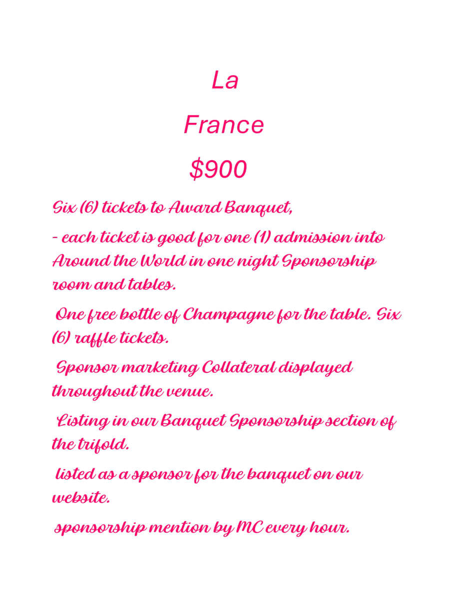 • Six (6) tickets to Award Banquet, each ticket is good for one (1) admission into Around the World in one night Sponsorship room and tables.